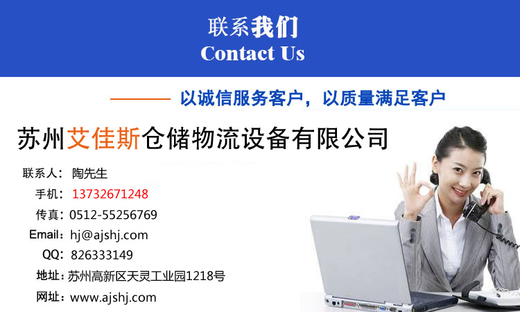 姑苏艾佳斯仓储物流装备无限公司 接洽人:陶师长教师 手机:13732671248 传真:0512-55256769 QQ:826333149 邮箱:hj@hjlcc.cn 地点:姑苏高新区天灵产业园1218号 网址:www.hjlcc.cn